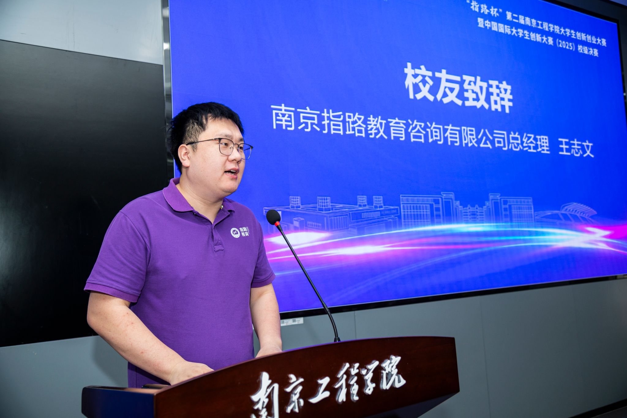 本次大赛得到了校友企业南京指路教育咨询有限公司的大力支持,公司总经理王志文来到大赛现场,并分享了母校浓厚的创业文化对自己创业之路的深远影响,希望能借此机会回馈母校,为学弟学妹们的梦想助力。