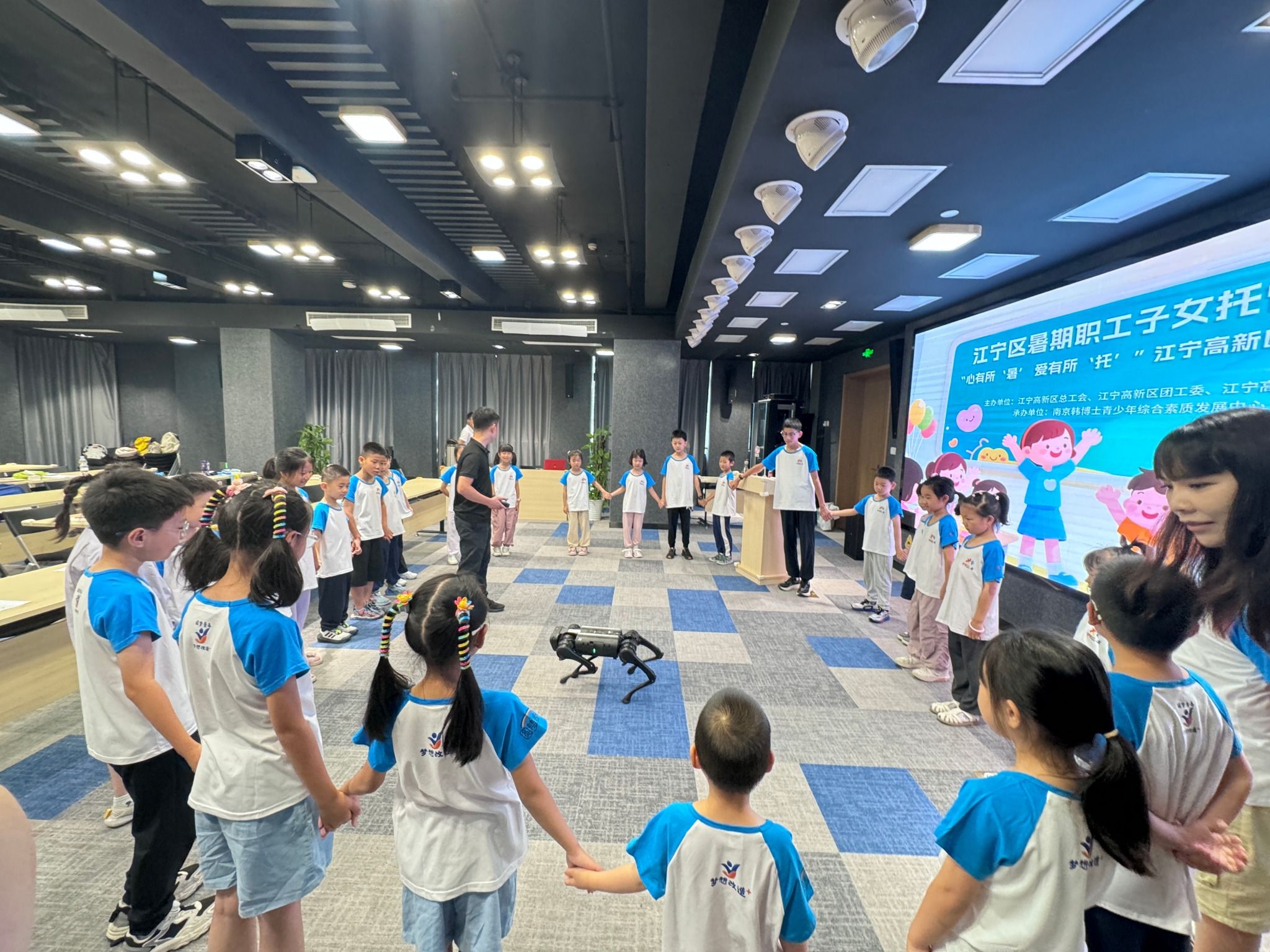 团队成员以“陪伴者+引导者”的双重角色,将课程融入趣味场景。科技启蒙课上,机械狗机器人化身“科技小助手”,灵活完成各项指令,孩子们轮流操作、观察反馈,在与智能设备的互动中萌发对科技的探索兴趣;科学实验课通过现象观察、原理讲解与动手复现,让“液氮实验”涉及的低温特性、物质相变等抽象科学原理变得可触可感;素质拓展课设计了“词王争霸赛”“合作搭积木”等游戏,让孩子们在奔跑与互动中释放活力,逐步领悟沟通配合的意义。