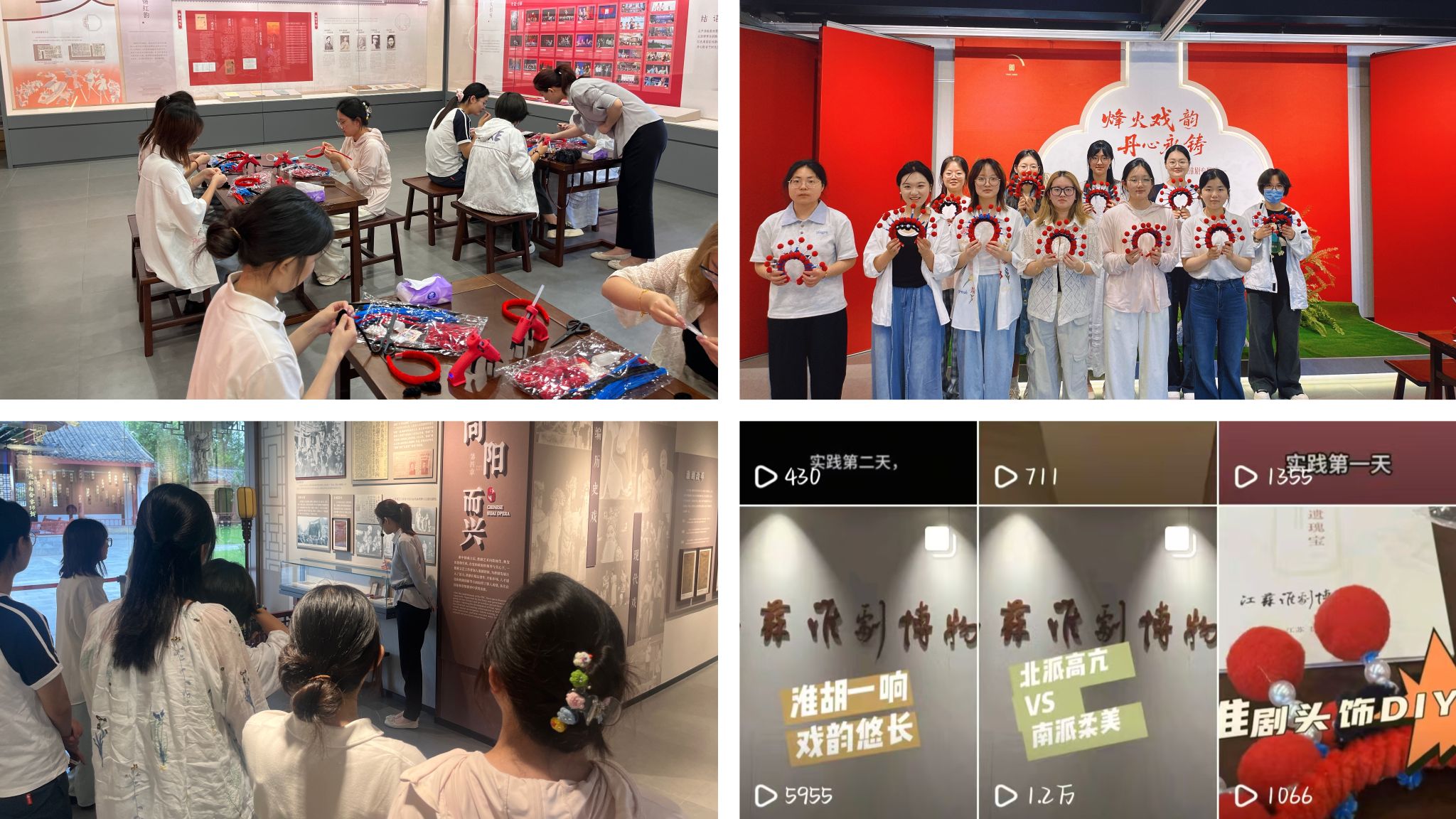 在非遗工坊,同学们在传承人指导下学习制作淮剧戏服与头饰,亲手完成凤冠珠花、鬓边流苏等经典元素的制作,切身感受戏曲装饰艺术的美学价值。在淮剧博物馆,团队成员通过早期戏服、手抄剧本、泛黄戏单等珍贵展品,系统了解淮剧发展历史,并充分发挥外语专业优势,围绕展厅戏曲术语解说、淮剧经典剧目概述、访谈戏剧传承人等方面,整理完成淮剧关键词双语对照表,制作双语宣传手册;创作“外院学子带您识淮剧”系列短视频,在抖音、小红书等平台进行推广。