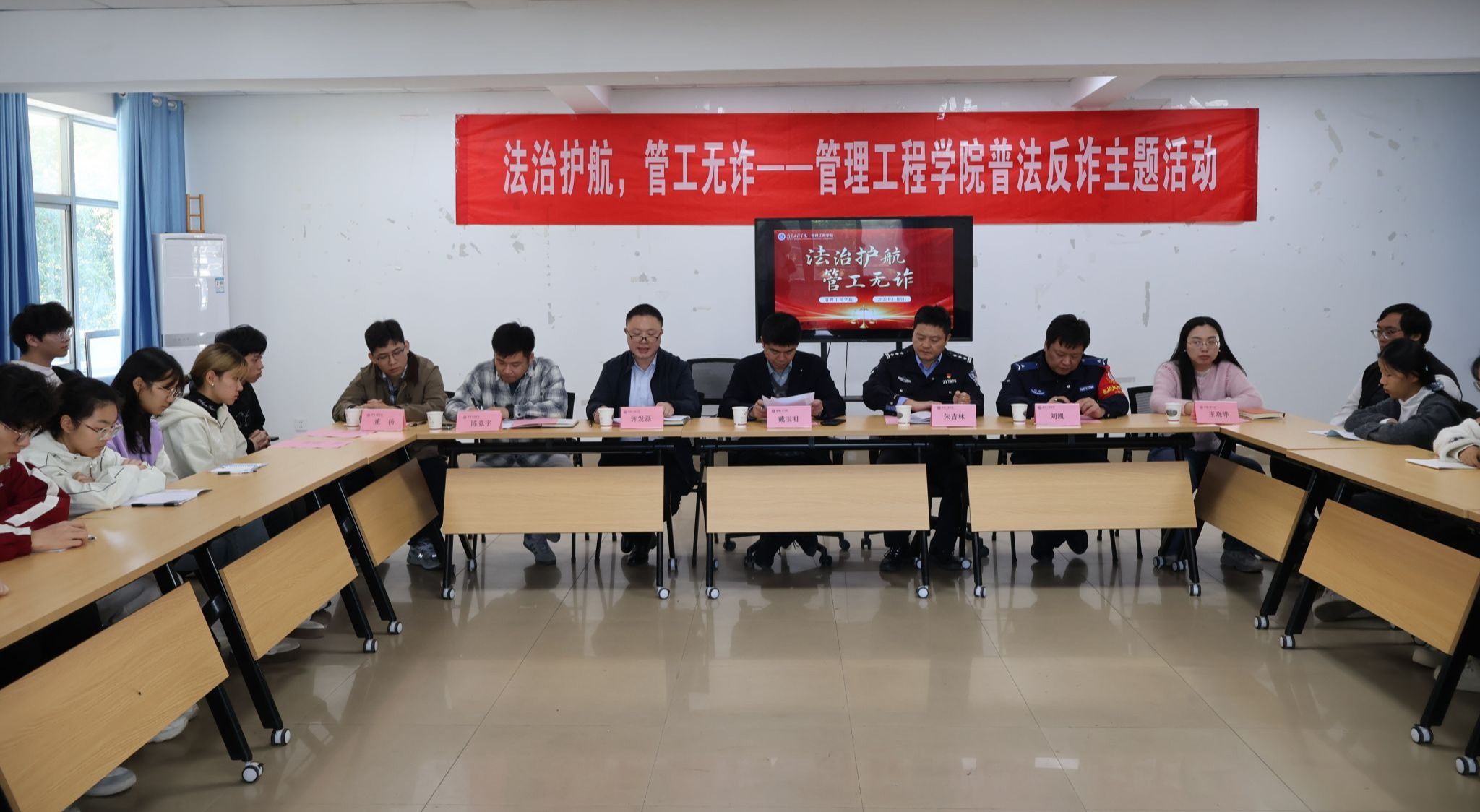 为深化立德树人根本任务,提升师生法治素养与安全防范能力,11月5日,在国家宪法日来临之际,管理工程学院在北区九号站“一站式”学生社区举办普法反诈主题活动。活动汇聚学生工作处、保卫处、警务多方力量,为校园安全筑起坚实的法治与思想防线。学生工作处相关负责人、校警务室驻校民警、学院学生工作负责人、学院辅导员及学生代表共同参与。